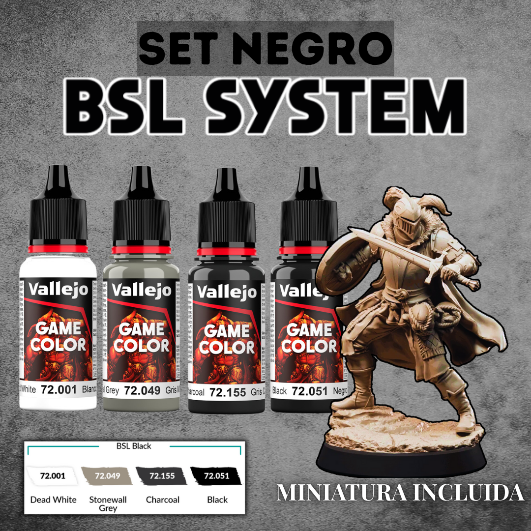 El sistema BSL (Base, Sombra, Luz) de Vallejo es una forma práctica y rápida de elegir colores para tus miniaturas. Cada set agrupa tres tonos compatibles entre sí: uno para la base, otro más oscuro para las sombras y un tercero más claro para las luces. Además, incluye un color complementario, pensado para resaltar detalles y generar contrastes más llamativos.