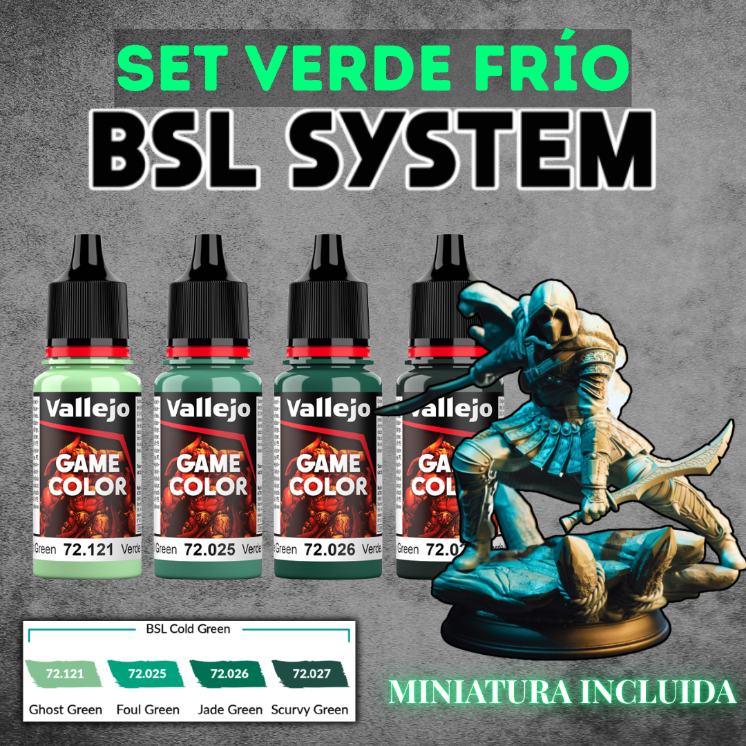El sistema BSL (Base, Sombra, Luz) de Vallejo es una forma práctica y rápida de elegir colores para tus miniaturas. Cada set agrupa tres tonos compatibles entre sí: uno para la base, otro más oscuro para las sombras y un tercero más claro para las luces. Además, incluye un color complementario, pensado para resaltar detalles y generar contrastes más llamativos.
