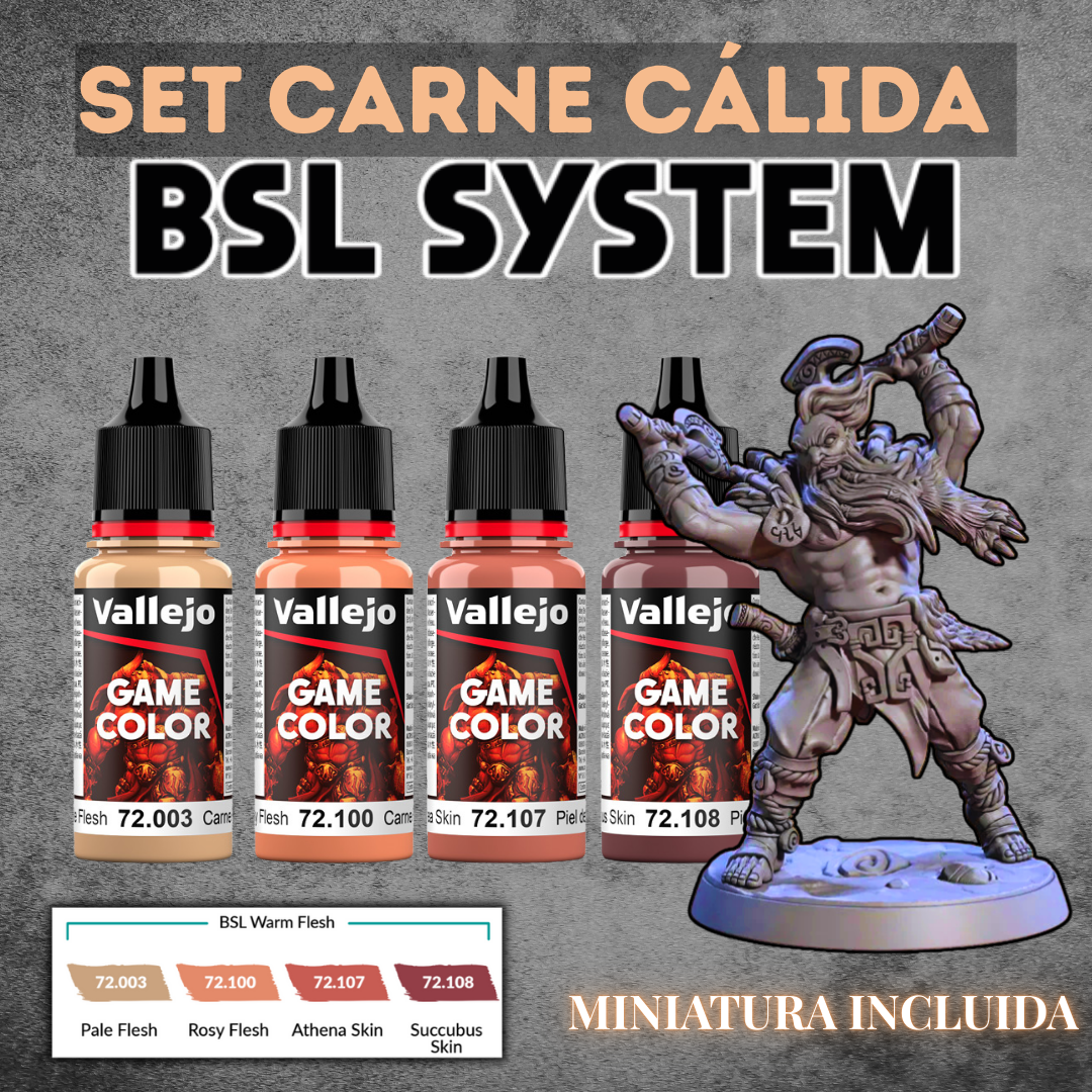 El sistema BSL (Base, Sombra, Luz) de Vallejo es una forma práctica y rápida de elegir colores para tus miniaturas. Cada set agrupa tres tonos compatibles entre sí: uno para la base, otro más oscuro para las sombras y un tercero más claro para las luces. Además, incluye un color complementario, pensado para resaltar detalles y generar contrastes más llamativos.