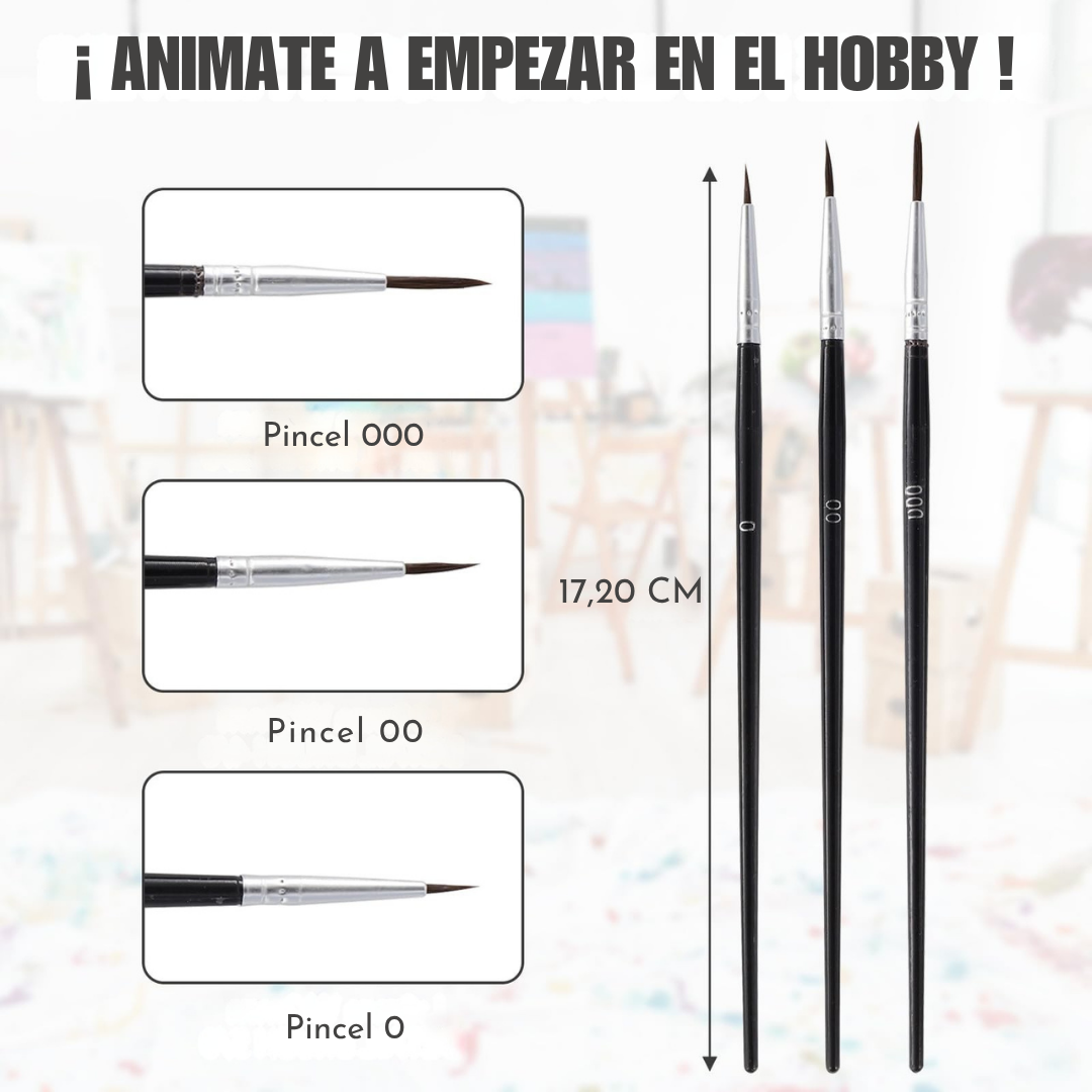 Ideal para quienes dan sus primeros pasos en el mundo de la pintura de miniaturas. Incluye tres tamaños: 0, 00 y 000, cubriendo desde detalles finos hasta trazos más amplios.