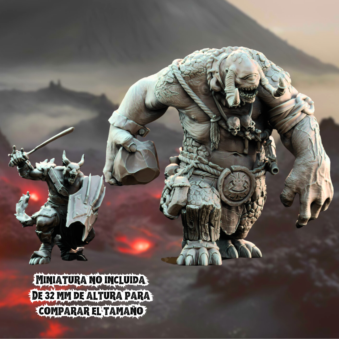 En los oscuros y misteriosos rincones del mundo de la fantasía, emerge una figura colosal que siembra el terror entre sus enemigos: el Cíclope Gigante. Esta criatura de una sola mirada tiene la capacidad de infundir miedo hasta en los corazones más valientes. Con una altura titánica y una musculatura descomunal, el cíclope es una fuerza de la naturaleza. Su piel gruesa y rugosa está adornada con cicatrices de antiguas batallas, testigos mudos de su brutalidad y resistencia.