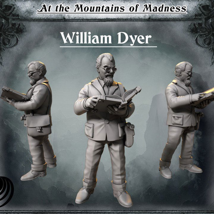 La miniatura "William Dyer" representa a un personaje académico, con un aspecto serio y concentrado. Está vestido con un traje y sostiene un libro abierto, como si estuviera leyendo o tomando notas importantes. Su pose y expresión sugieren que es un hombre de conocimientos, posiblemente dirigiendo o participando en una expedición científica. Los detalles como las gafas, el bigote y la barba añaden un toque de distinción al personaje, enfatizando su rol intelectual y de liderazgo en la narrativa de la miniatura.